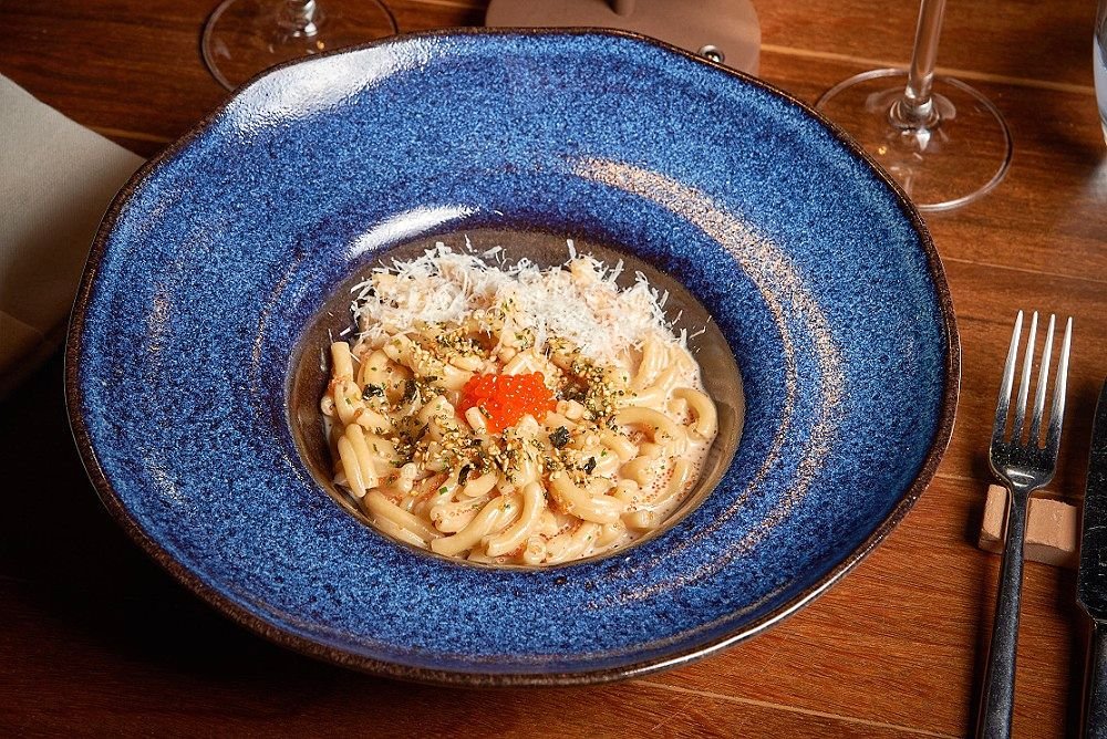 Foto do chef e do prato casarecce mentaiko: Jonas Bodruk/Divulgação.