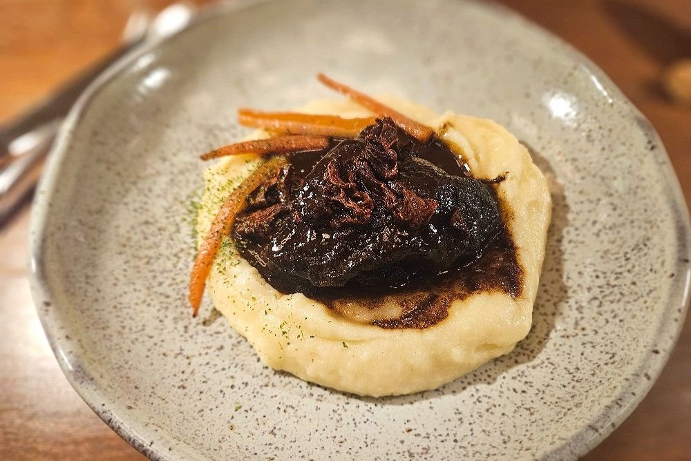 A bochecha bovina é cozida lentamente em vinho tinto, resultando num molho apurado e cheio de sabor. É servida com purê de batata, molho espagnole, cogumelo cantarelo e pó de salsão.