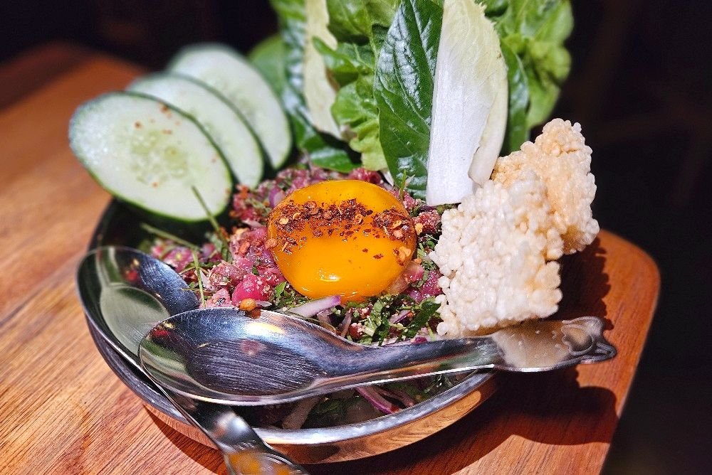Duas pedidas certeiras e deliciosas são o koi neua (58 reais; foto), tartar de carne bovina à moda do nordeste tailandês, e o gai thod sando (55 reais; foto), apetitoso sanduíche de peito de frango empanado com pepino, cenoura, folhas de coentro e maionese típica da região de Isan.