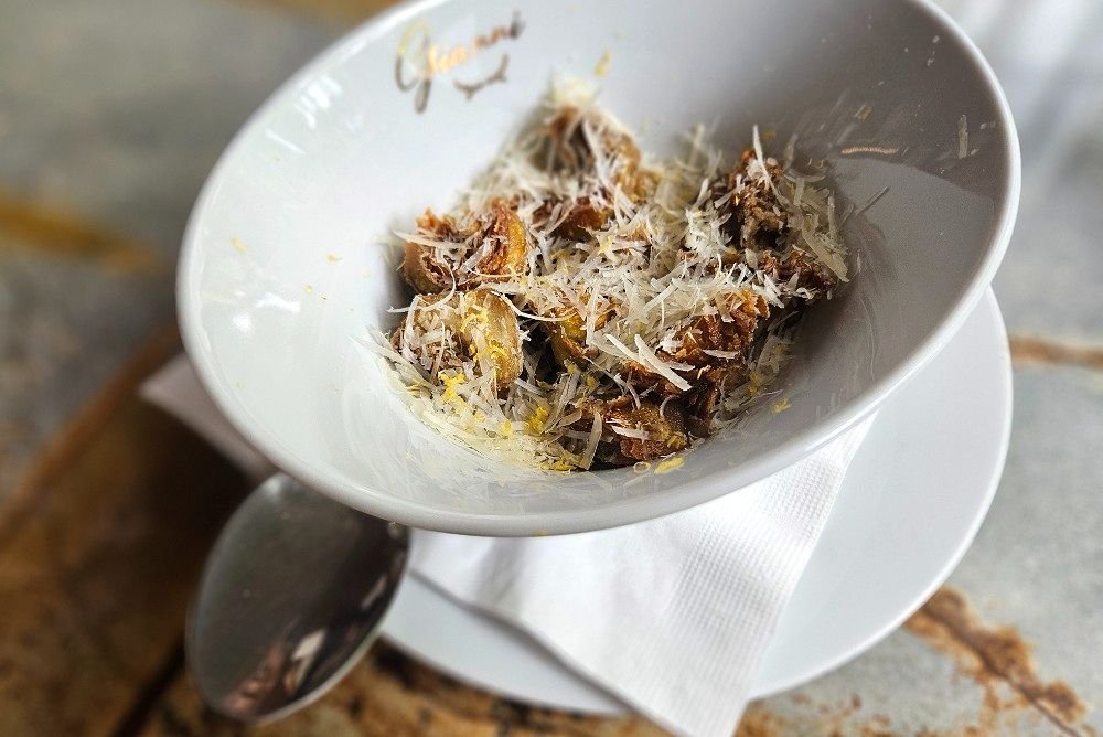 As entradas, sem muita originalidade, seguem pelo caminho seguro dos carpaccios, bruschetta, burrata, vitello tonnato e carciofi alla giudia (por doídos 96 reais; foto), que traz mini alcachofra frita sobre fonduta de parmigiano reggiano e raspas de limão-siciliano.