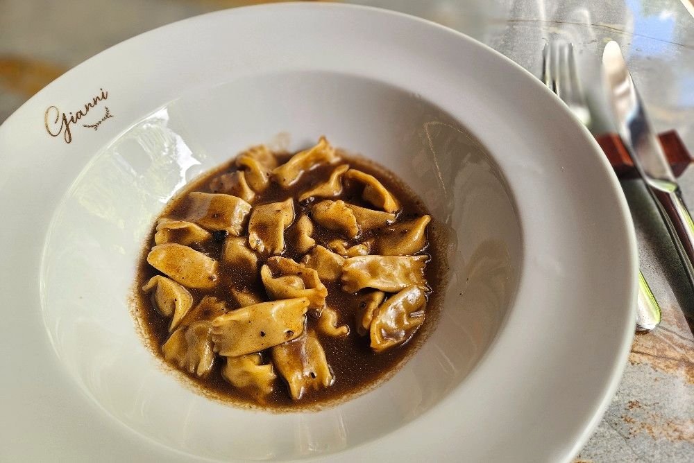 O prato traz delicados mini raviólis de carne ao molho do próprio assado, um clássico da culinária piemontesa. Dica: fica ainda melhor sem o azeite de trufa que finaliza a receita.