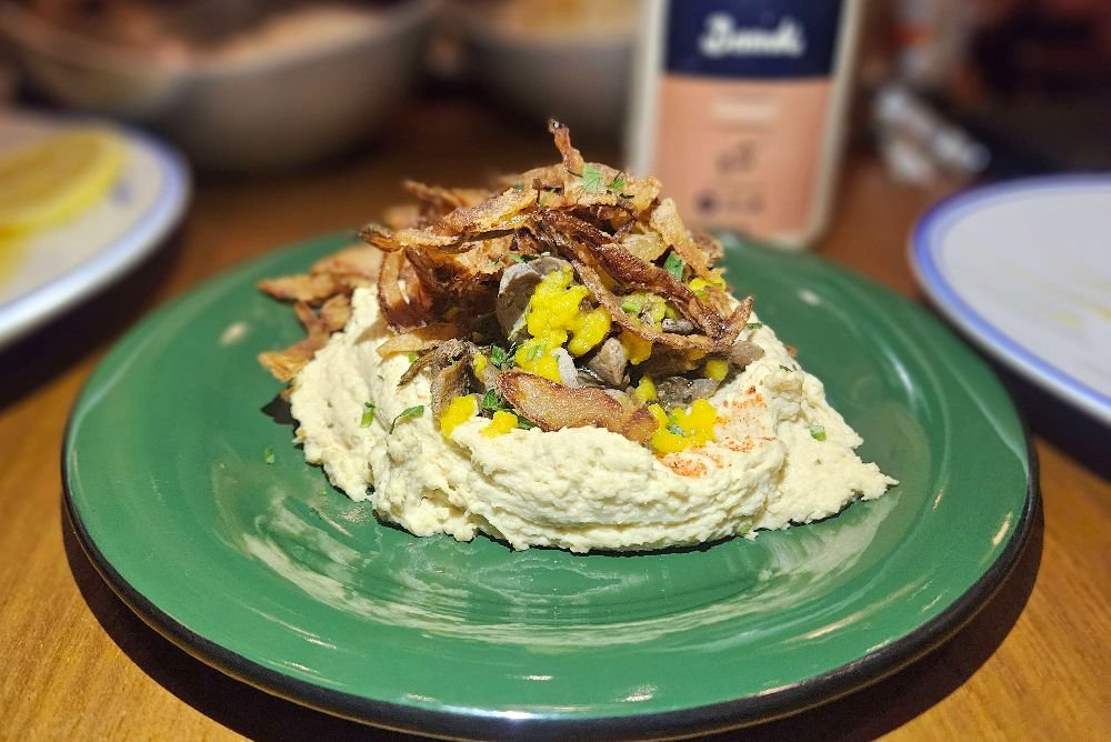 A esfirra aberta de queijo com zaatar (13 reais) conquista pelo sabor, embora pudesse ter massa com um pouco mais de estrutura. Saem-se melhor o faláfel de formato redondo e achatado (32 reais; cinco unidades) e o saboroso homus pitriot (45 reais; foto), coberto por cogumelos salteados, molho amba e cebola frita.