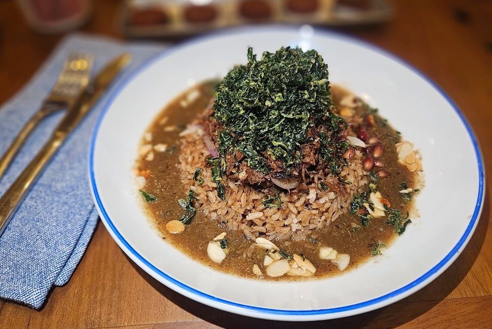 Entre os pratos principais, a sugestão mais vistosa é o arroz de cordeiro (75 reais; foto). Bem servido, úmido e apetitoso, é preparado com o próprio caldo de cozimento da carne e chega coberto por pernil de cordeiro desfiado. Na finalização, recebe sementes de romã, lâminas de amêndoas e couve frita crocante.