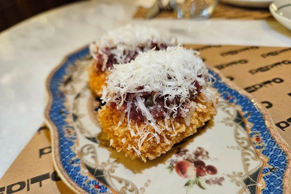 Também já conquistou a clientela o bolinho chamado ‘telefone sem fio’ (40 reais; duas unidades; foto). Inspirado no supplì al telefono, clássico absoluto da comida de rua de Roma, o croquete de arroz chega sem o queijo derretido no meio e sim coroado por steak tartar.